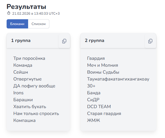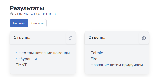 Группа "Участники" в 21-00: Нам только спросить — Компашка Три поросёнка — Отвергнутые Сейшн — Команда ДА пофигу вообще — Irons Барашки — Хватить бухать (Недопуск к турниру в связи с отсутствием мин. количества игроков - 2). Группа "Призёры" в 21:30: Че-то там название команды — Чебурашки Чебурашки — TMNT TMNT — Че-то там название команды 1 место — Че-то там название команды (5 очков) 2 место — TMNT (4 очка) 3 место— Чебурашки (2 очка) Дисквалификации в связи с неявкой на турнир: Последний раз редактировалось Venom_IV, 27.02.2026 в 23:55. |